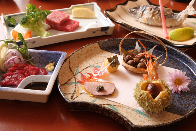 自家栽培した野菜や米、または地元産の食材を使用した会席料理は、味の良さはもちろん、安心・安全なメニューです。「自分が本当においしいと思うものを食べてもらいたいんです」という主人は、日本全国のおいしいものを食べ歩くこともあるという食通で、自らが包丁を握り、仕入れまで受け持っています。和食メニューの合間に洋風のメニューも盛り込まれ、バラエティー豊かな構成です。締めのデザート・焼きプリンは、女性に限らず大好評です。満腹になること請け合いの会席を楽しみにお越しください。