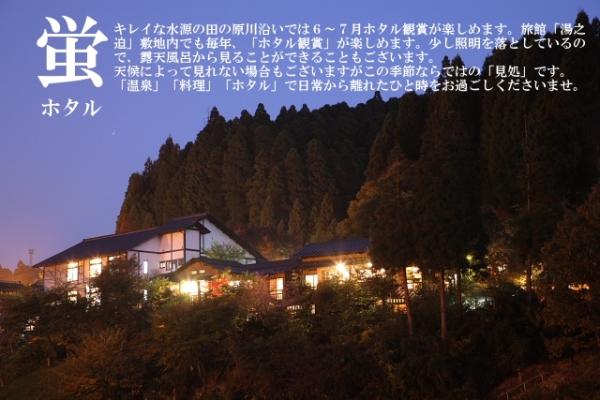 連休はなかなか忙しくてお休みがとれない!という方には5月下旬から7月初旬の蛍シーズンのお泊りをオススメします。お天気のいい日は露天風呂から見れたりすることも!!
